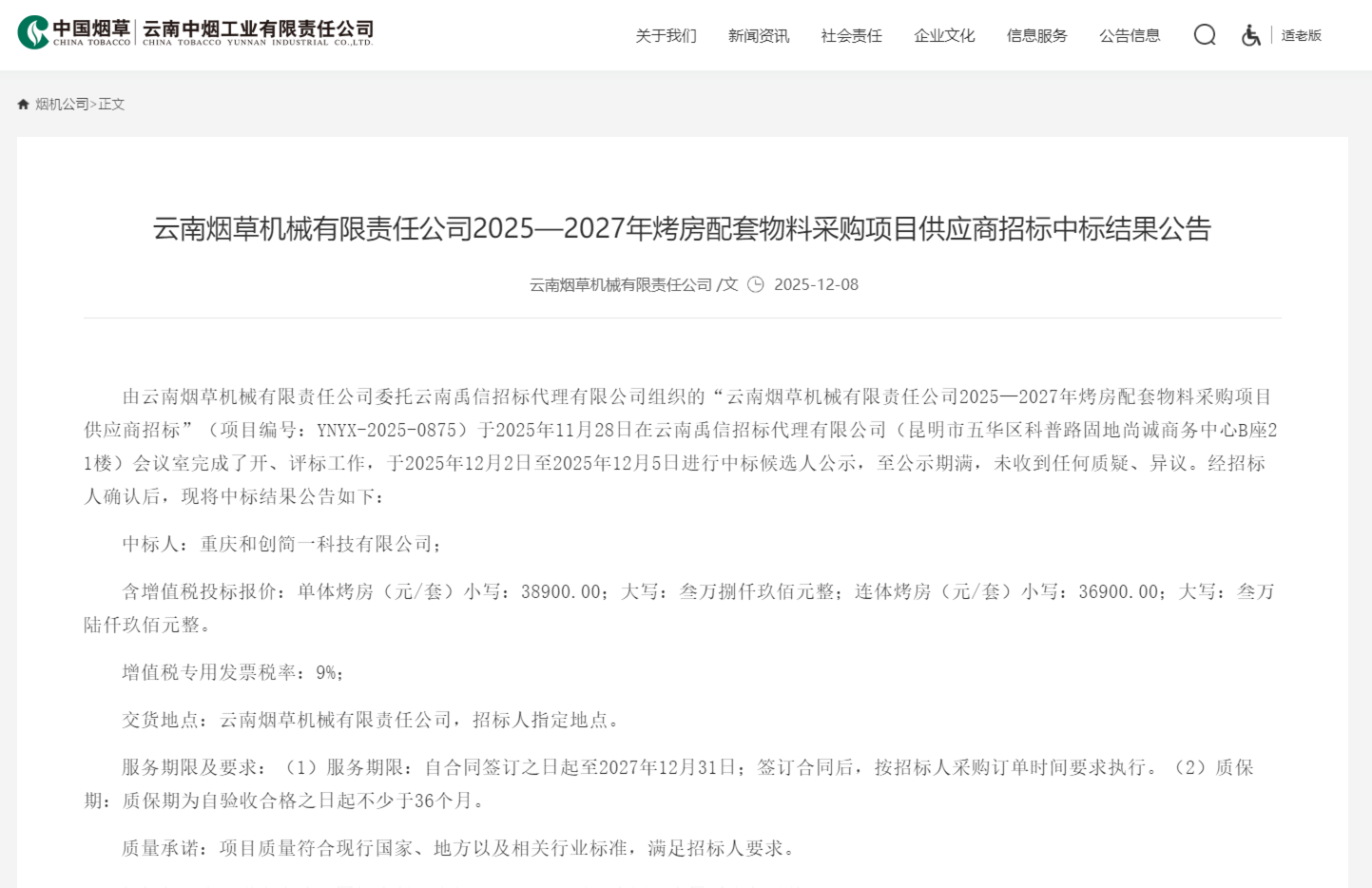 近日,重慶和創(chuàng)簡一科技有限公司(以下簡稱“和創(chuàng)簡一”)憑借領(lǐng)先的石墨烯電熱技術(shù)、成熟的產(chǎn)品方案、雄厚的研發(fā)實(shí)力及豐富的行業(yè)服務(wù)經(jīng)驗(yàn),成功中標(biāo)云南煙草機(jī)械有限責(zé)任公司2025—2027年烤房配套物料采購項(xiàng)目,將為其供應(yīng)30座石墨烯電熱烤房。此次中標(biāo)不僅是市場對和創(chuàng)簡一核心技術(shù)與綜合實(shí)力的高度認(rèn)可,更標(biāo)志著公司在煙草行業(yè)綠色智能烘烤裝備領(lǐng)域?qū)崿F(xiàn)重要突破,為深耕高端煙草配套市場奠定堅(jiān)實(shí)基礎(chǔ)。